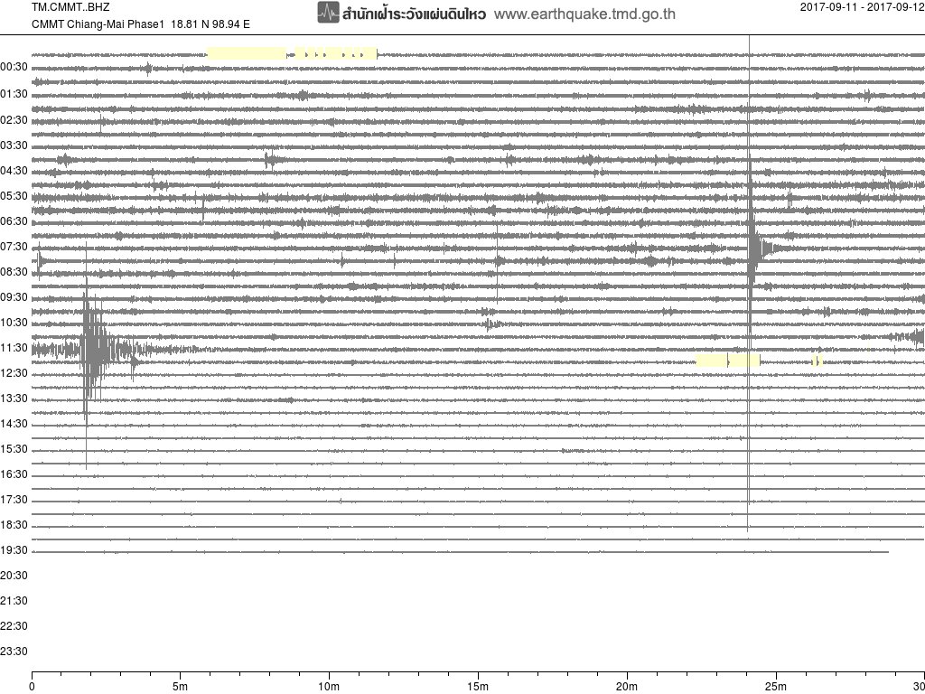 - 06:45 กราฟแผ่นดินไหว ช่วง 24 ชั่วโมงที่ผ่านมา บันทึกจากสถานี เขื่อนกิ่วลม จ.ลำปาง กรมอุตุฯ (กราฟนี้เน้นใช้ประโยชน์เรื่องของเวลาที่เกิดแผ่นดินไหว โดยแยกสีเป็นแดงน้ำเงินสีละครึ่งชั่วโมงเพื่อให้ดูง่าย ส่วนเรื่องขนาดแผ่นดินไหว กราฟนี้ไม่อาจใช้ระบุตัวเลขที่ชัดเจน)