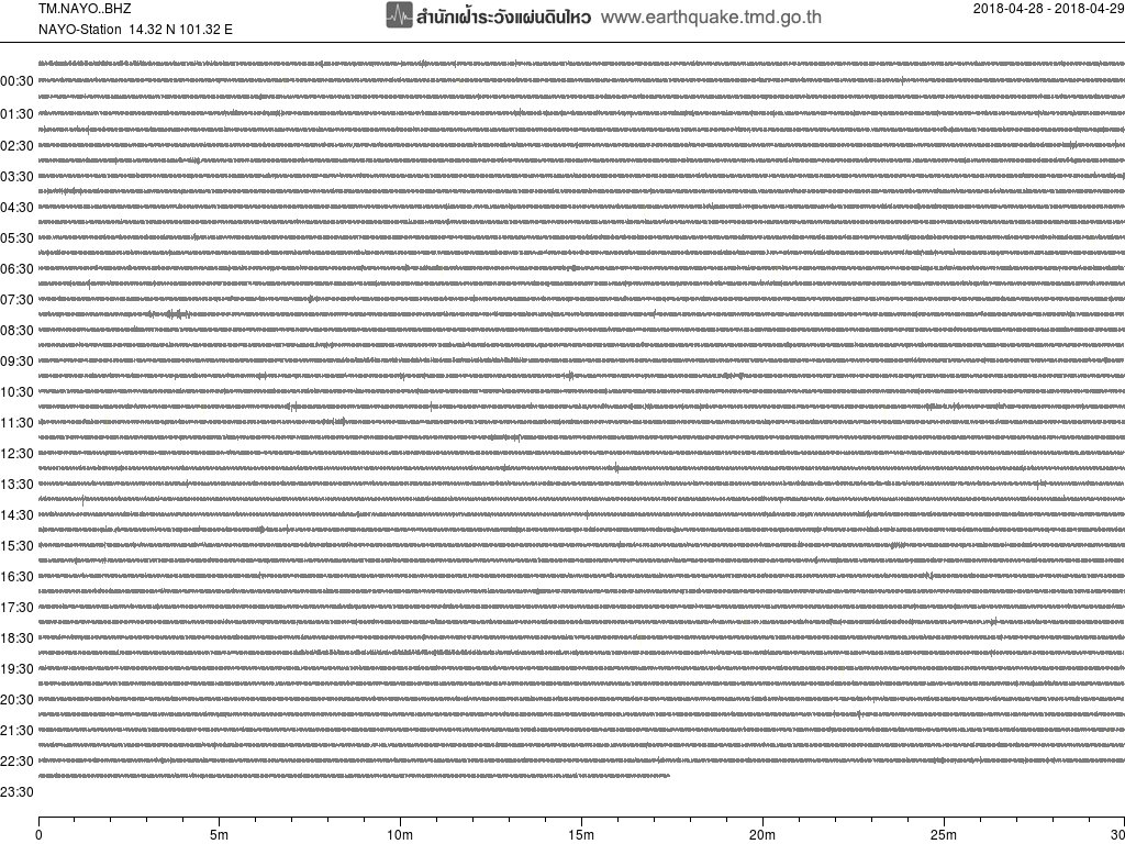 - กราฟแผ่นดินไหวจากสถานี นครนายก ของสำนักเฝ้าระวังฯ กรมอุตุฯ จากเวลา 07:00 เมื่อวานนี้ถึง 07:00 เช้านี้