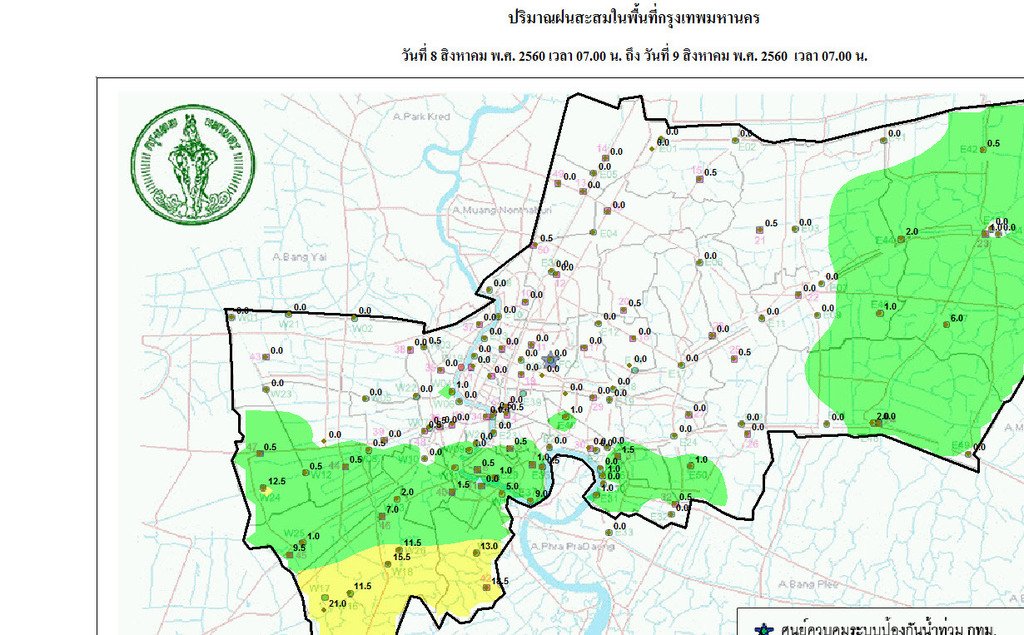 - 07:00 แผนที่แสดงปริมาณฝนในกรุงเทพฯย้อนหลัง 24 ชั่วโมงจากศูนย์ป้องกันน้ำท่วม กทม