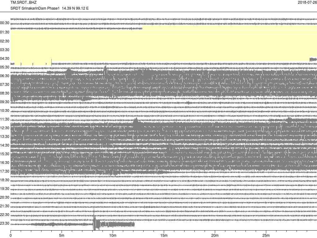 - 06:45 กราฟแผ่นดินไหว ช่วง 24 ชั่วโมงที่ผ่านมา บันทึกจากสถานี เขื่อนกิ่วลม จ.ลำปาง กรมอุตุฯ (กราฟนี้เน้นใช้ประโยชน์เรื่องของเวลาที่เกิดแผ่นดินไหว โดยแยกสีเป็นแดงน้ำเงินสีละครึ่งชั่วโมงเพื่อให้ดูง่าย ส่วนเรื่องขนาดแผ่นดินไหว กราฟนี้ไม่อาจใช้ระบุตัวเลขที่ชัดเจน)