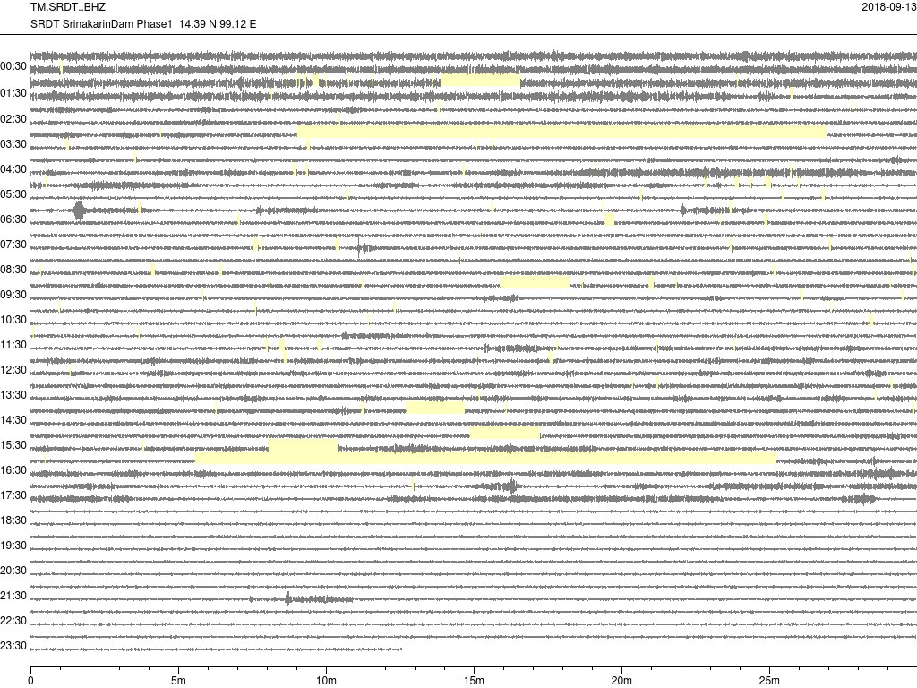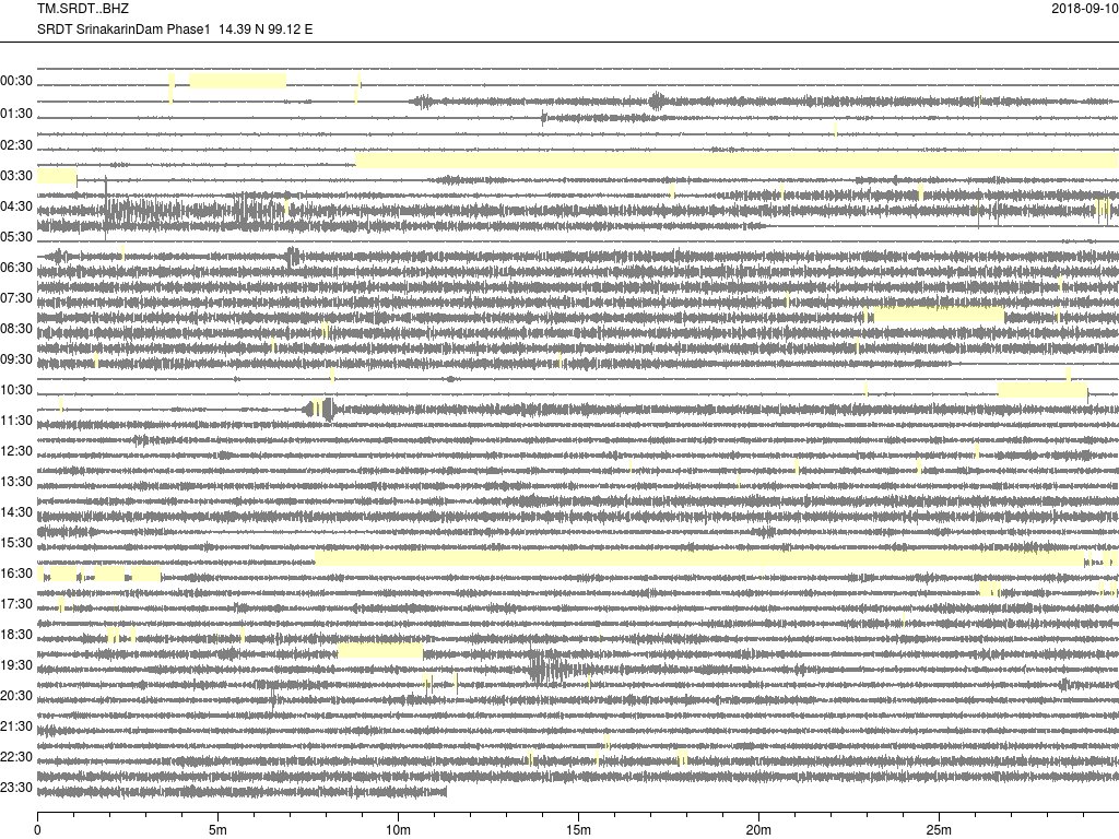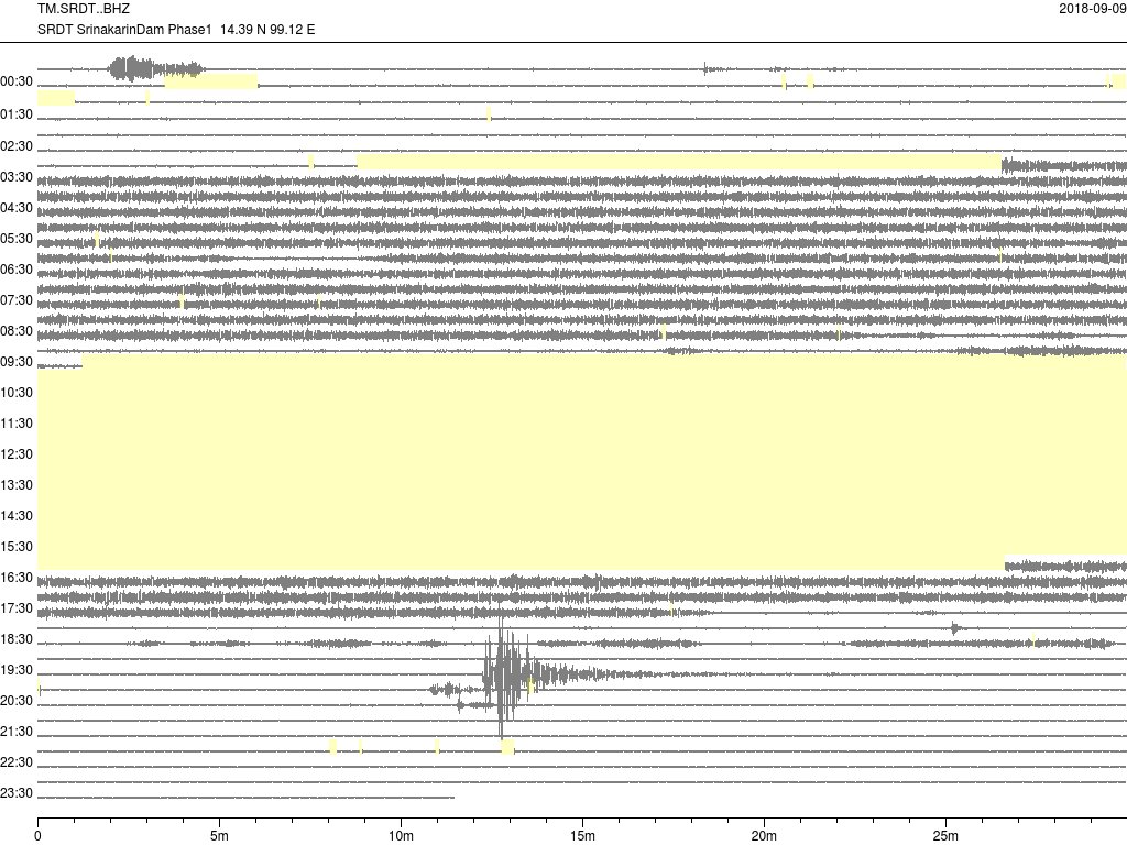 - 06:45 กราฟแผ่นดินไหว ช่วง 24 ชั่วโมงที่ผ่านมา บันทึกจากสถานี เขื่อนกิ่วลม จ.ลำปาง กรมอุตุฯ (กราฟนี้เน้นใช้ประโยชน์เรื่องของเวลาที่เกิดแผ่นดินไหว โดยแยกสีเป็นแดงน้ำเงินสีละครึ่งชั่วโมงเพื่อให้ดูง่าย ส่วนเรื่องขนาดแผ่นดินไหว กราฟนี้ไม่อาจใช้ระบุตัวเลขที่ชัดเจน)