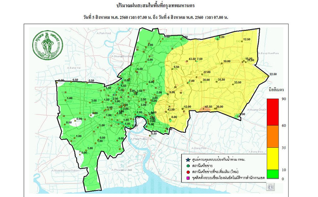 - 07:00 แผนที่แสดงปริมาณฝนในประเทศไทยย้อนหลัง 24 ชั่วโมง (07:00 วานนี้้ถึง 07:00 วันนี้) จากกรมอุตุฯ