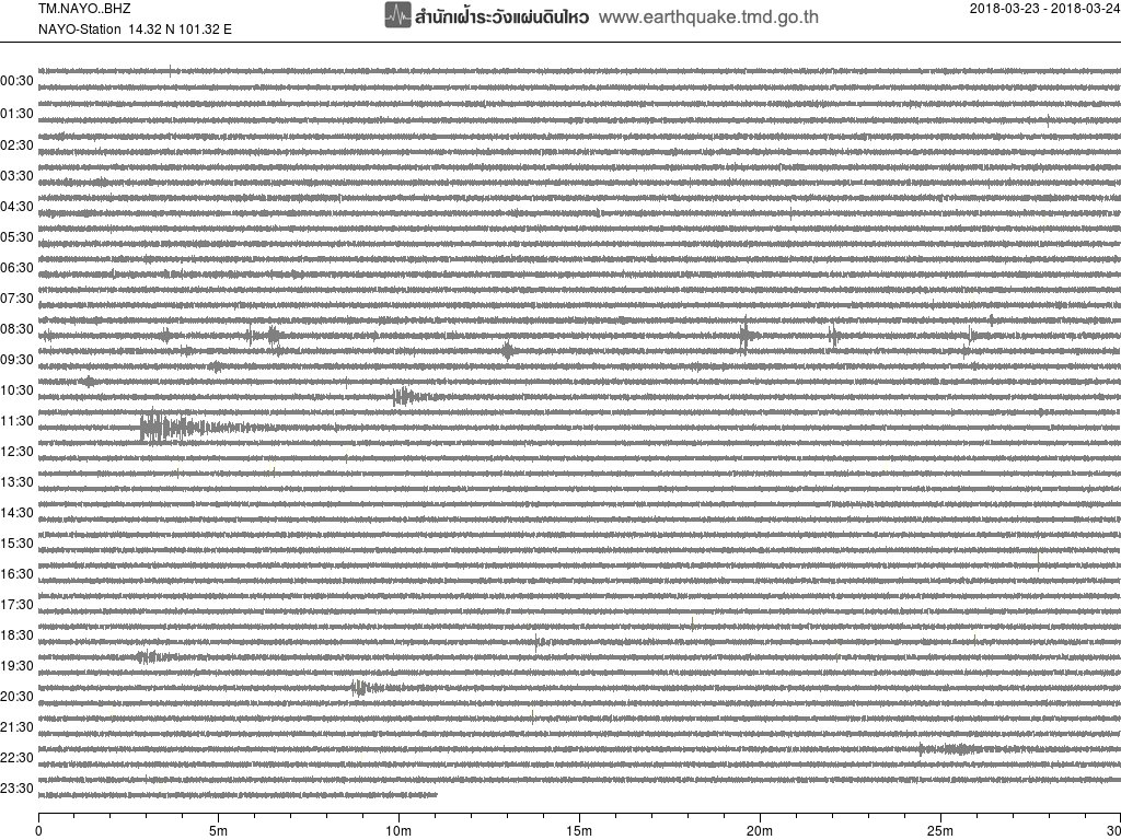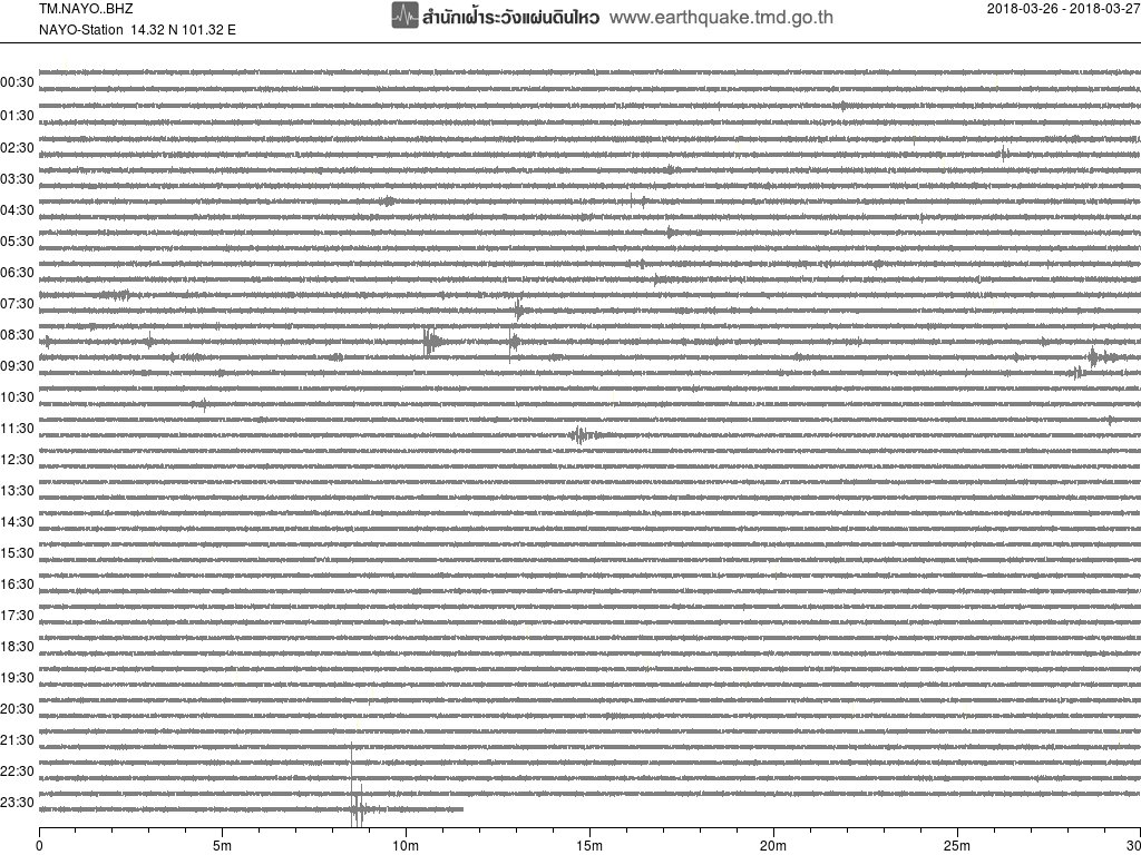 - กราฟแผ่นดินไหวจากสถานีเขื่อนวชิราลงกรณ์ จ.กาญจนบุรี(KHLT) ของสำนักเฝ้าระวังฯ กรมอุตุฯ จากเวลา 07:00 เมื่อวานนี้ถึง 06:45 เช้านี้