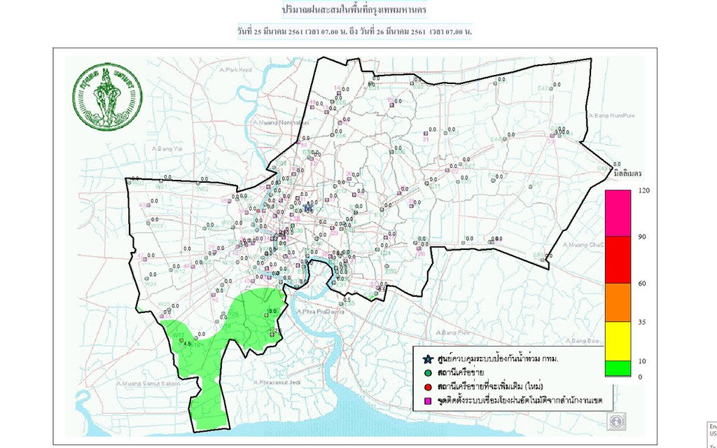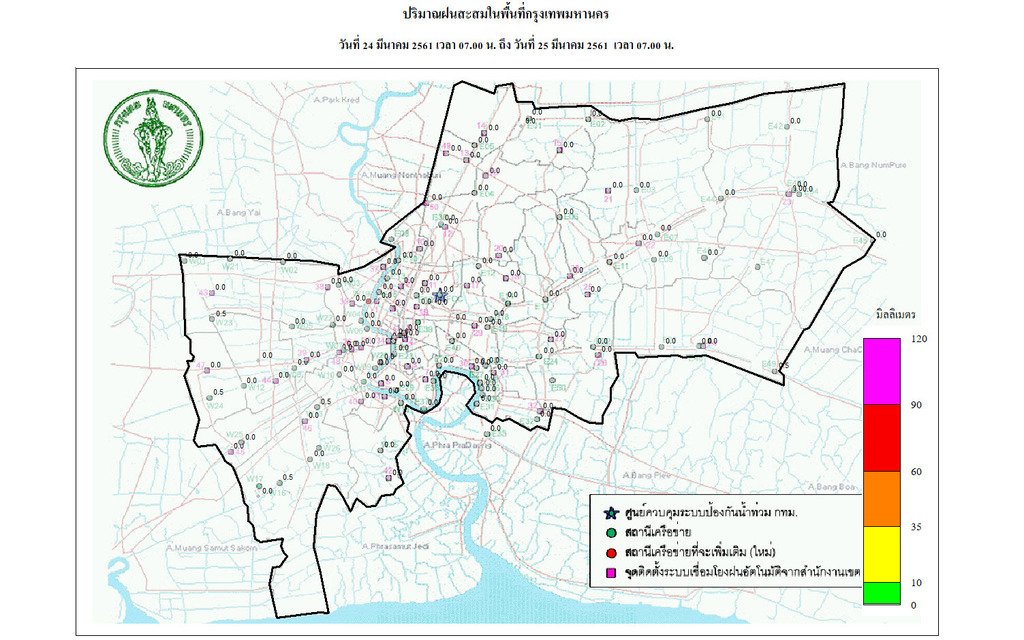 - 07:00 แผนที่แสดงปริมาณฝนในกรุงเทพฯย้อนหลัง 24 ชั่วโมงจากศูนย์ป้องกันน้ำท่วม กทม