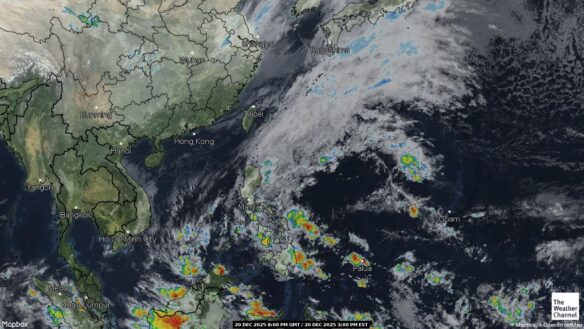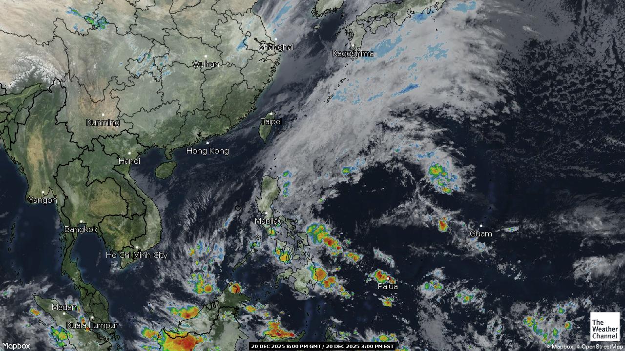 - 03:00 ภาพดาวเทียมย้อมสีจาก TWC แสดงกลุ่มฝนในเอเชียตะวันออกเฉียงใต้และโซนตะวันตกของมหาสมุทรแปซิฟิกเวลานี้