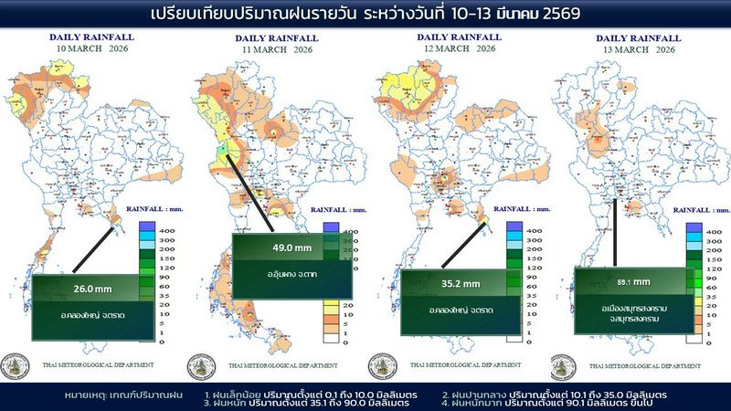 - 07:00 แผนที่เปรียบเทียบพื้นที่ที่มีปริมาณฝนสูงสุดในประเทศไทยรอบ 24 ชั่วโมงย้อนหลัง 4 วัน