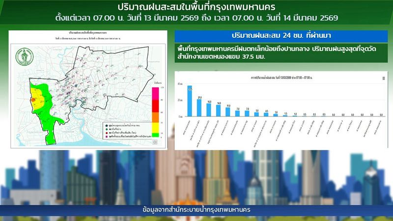 - 07:00 แผนที่แสดงบริเวณและปริมาณฝนตกในเขตกรุงเทพฯ รอบ 24 ชั่วโมงที่ผ่านมา โดย สำนักระบายน้ำ กทม.