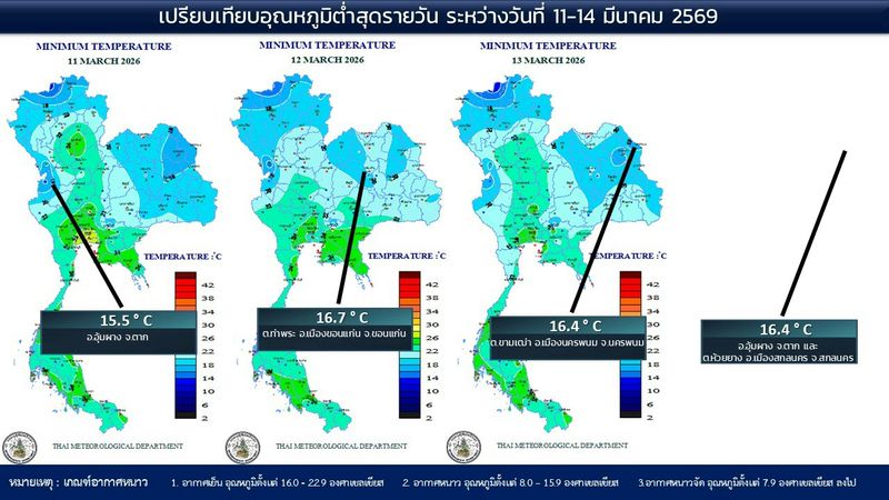 - 07:00 แผนที่เปรียบเทียบอุณหภูมิต่ำสุดในประเทศไทยรอบ 24 ชั่วโมงย้อนหลัง 4 วัน