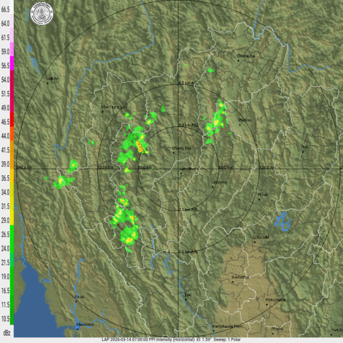 - 15:15 เรดาร์ตรวจอากาศ TMD แบบเคลื่อนไหว รัศมี 240 กม. ศูนย์กลางที่ จ.ลำพูน แสดงกลุ่มฝนตลอด 1 ชั่วโมง 15 นาที ที่ผ่านมา