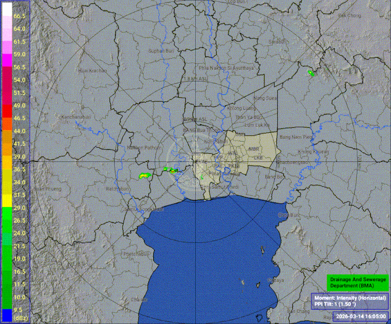 - 17:00 เรดาร์ตรวจฝนจากสำนักการระบายน้ำ กทม ที่หนองแขม (แบบเคลื่อนไหว) แสดงกลุ่มฝนที่ตกในกรุงเทพฯและปริมณฑลรวมทั้งบางจังหวัดในภาคกลางตอนล่างและภาคตะวันออกตลอด 55 นาทีที่ผ่านมา