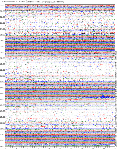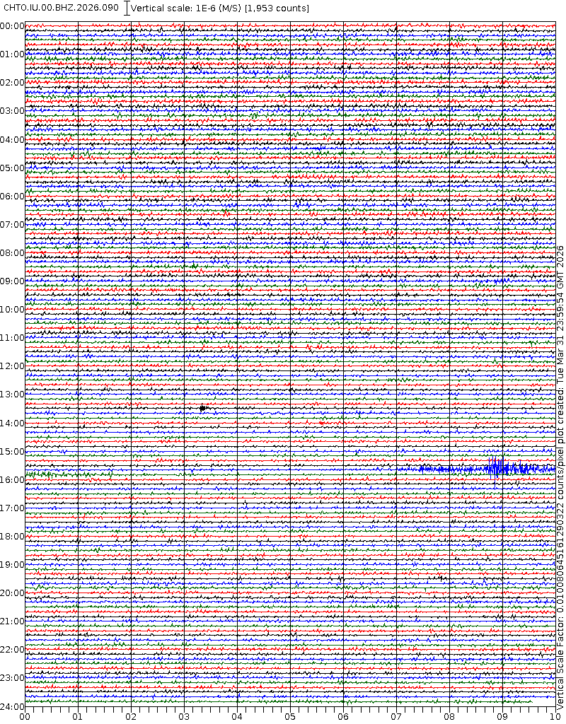 • 06:58 กราฟแผ่นดินไหวชนิดที่ใช้ดูเวลาเกิดเหตุเป็นหลัก แสดงภาพตามแนวตั้ง (BHZ) จากสถานีเครือข่าย IRIS สาขาเชียงใหม่ (CHTO) จาก 07:00 เช้าเมื่อวานนี้จนถึงเวลานี้ เส้นกราฟตามแนวนอนเส้นละ 10 นาที แยกสีเส้นกราฟเพื่อให้ดูได้ง่าย ช่องแบ่งตามแนวตั้งช่องละ 1 นาที