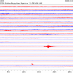 • 05:38 กราฟแผ่นดินไหว ช่วง 24 ชั่วโมงที่ผ่านมา บันทึกจากสถานีกรุงเนปิดอว์ ประเทศพม่า (กราฟนี้เน้นใช้ประโยชน์เรื่องของเวลาที่เกิดแผ่นดินไหว โดยแยกสีเป็นแดงน้ำเงินสีละครึ่งชั่วโมงเพื่อให้ดูง่าย ส่วนเรื่องขนาดแผ่นดินไหว กราฟนี้ไม่อาจใช้ระบุตัวเลขที่ชัดเจน)