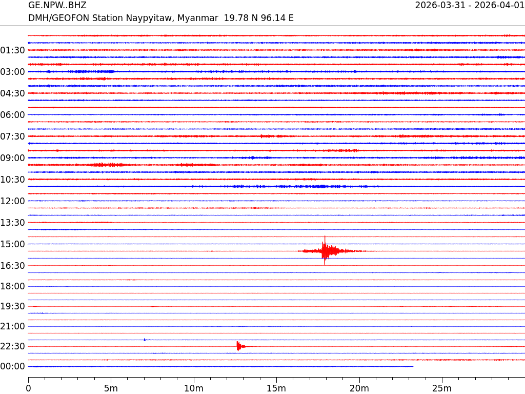 • 07:23 กราฟแผ่นดินไหว ช่วง 24 ชั่วโมงที่ผ่านมา บันทึกจากสถานีกรุงเนปิดอว์ ประเทศพม่า (กราฟนี้เน้นใช้ประโยชน์เรื่องของเวลาที่เกิดแผ่นดินไหว โดยแยกสีเป็นแดงน้ำเงินสีละครึ่งชั่วโมงเพื่อให้ดูง่าย ส่วนเรื่องขนาดแผ่นดินไหว กราฟนี้ไม่อาจใช้ระบุตัวเลขที่ชัดเจน)