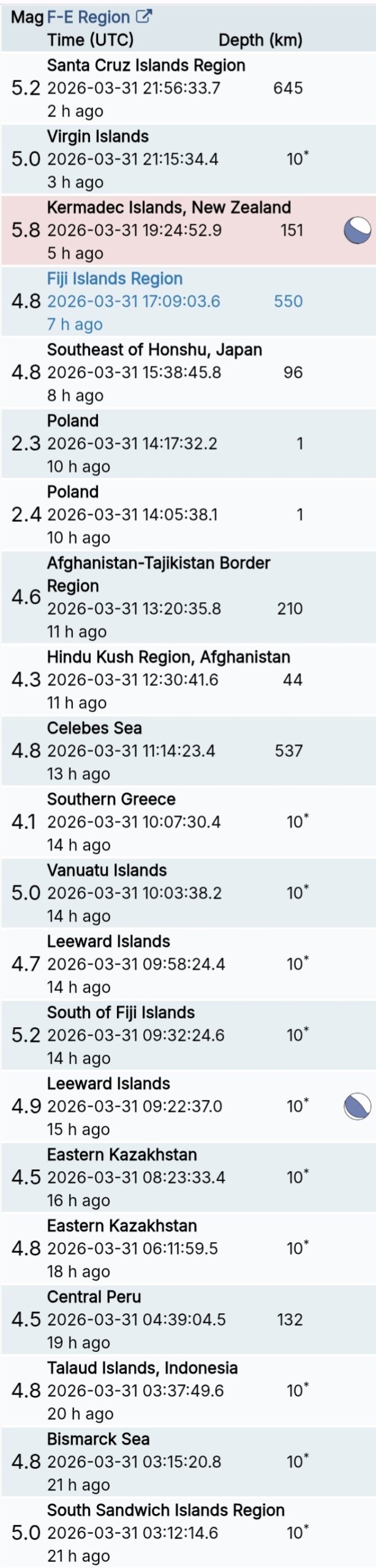 สรุปรายการแผ่นดินไหวและอาฟเตอร์ช็อกทั่วโลกจาก Geofon เยอรมนี ช่วง 07:00 เมื่อวานนี้ ถึง 07:00 เช้าวันนี้ (เวลาในตารางเป็น UTC ต้องบวก 7 ชั่วโมงให้เป็นเวลาไทย)