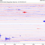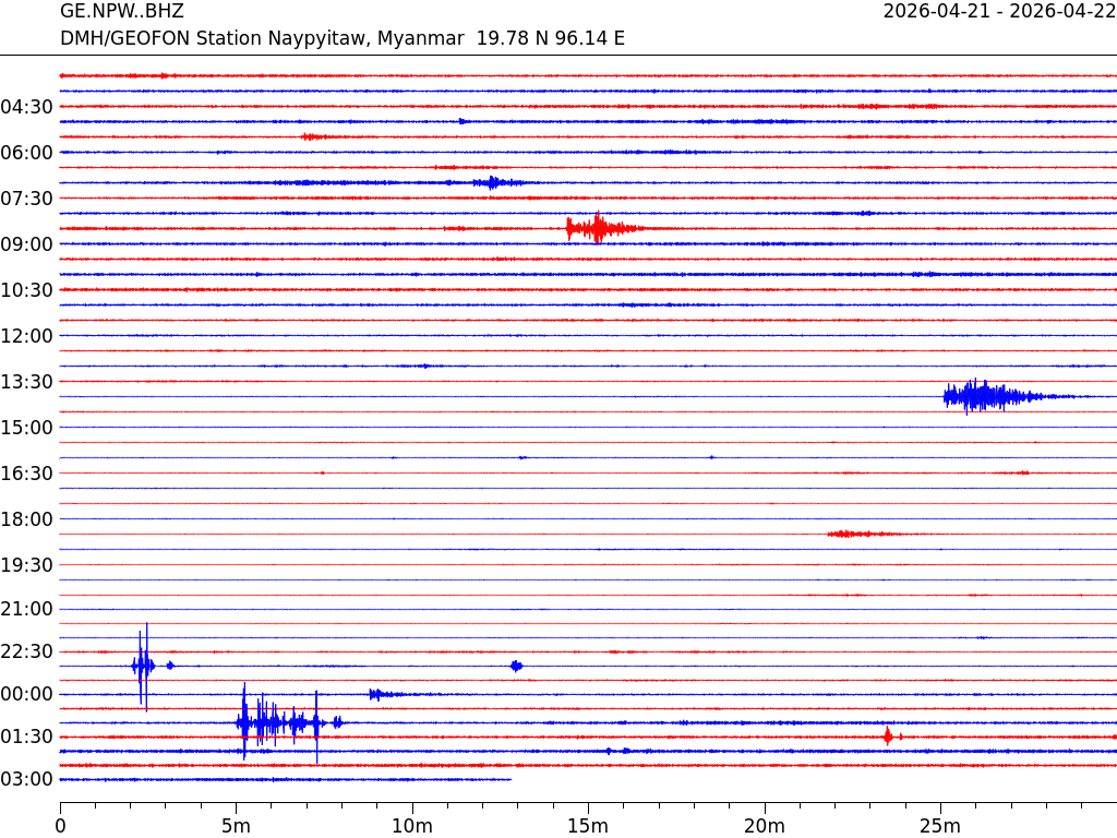 - 10:12 กราฟแผ่นดินไหว ช่วง 24 ชั่วโมงที่ผ่านมา บันทึกจากสถานีกรุงเนปิดอว์ ประเทศพม่า (กราฟนี้เน้นใช้ประโยชน์เรื่องของเวลาที่เกิดแผ่นดินไหว โดยแยกสีเป็นแดงน้ำเงินสีละครึ่งชั่วโมงเพื่อให้ดูง่าย ส่วนเรื่องขนาดแผ่นดินไหว กราฟนี้ไม่อาจใช้ระบุตัวเลขที่ชัดเจน)