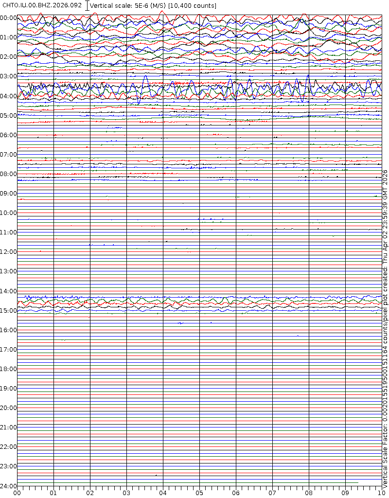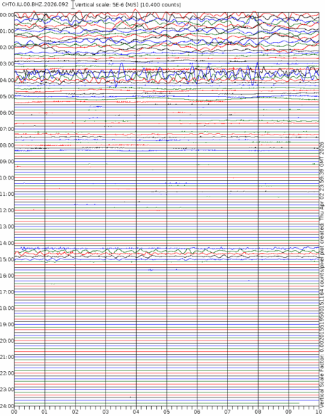 - 06:59 กราฟแผ่นดินไหวชนิดที่ใช้ดูเวลาเกิดเหตุเป็นหลัก แสดงภาพตามแนวตั้ง (BHZ) จากสถานีเครือข่าย IRIS สาขาเชียงใหม่ (CHTO) จาก 07:00 เช้าเมื่อวานนี้จนถึงเวลานี้ เส้นกราฟตามแนวนอนเส้นละ 10 นาที แยกสีเส้นกราฟเพื่อให้ดูได้ง่าย ช่องแบ่งตามแนวตั้งช่องละ 1 นาที
