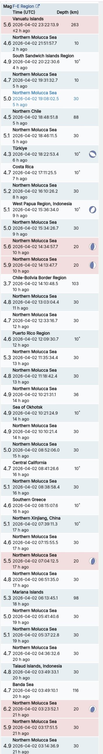 สรุปรายการแผ่นดินไหวและอาฟเตอร์ช็อกทั่วโลกจาก Geofon เยอรมนี ช่วง 07:00 เมื่อวานนี้ ถึง 07:00 เช้าวันนี้ (เวลาในตารางเป็น UTC ต้องบวก 7 ชั่วโมงให้เป็นเวลาไทย)