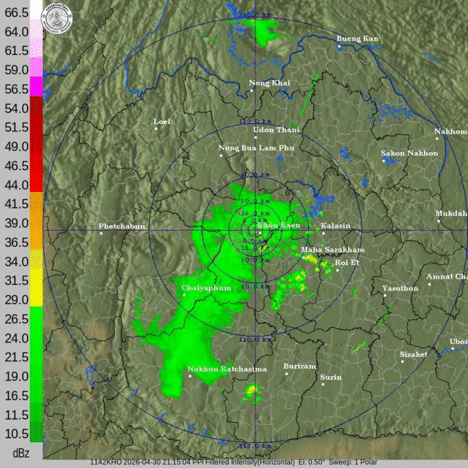 - 05:30 เรดาร์ตรวจอากาศ TMD แบบเคลื่อนไหว รัศมี 240 กม. ศูนย์กลางที่ ขอนแก่น แสดงกลุ่มฝนตลอด 1 ชั่วโมง 15 นาที ที่ผ่านมา