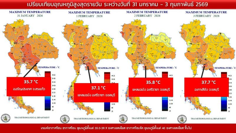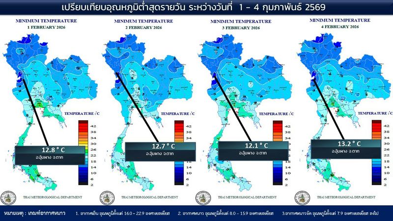 - 07:00 แผนที่เปรียบเทียบอุณหภูมิต่ำสุดในประเทศไทยรอบ 24 ชั่วโมงย้อนหลัง 4 วัน