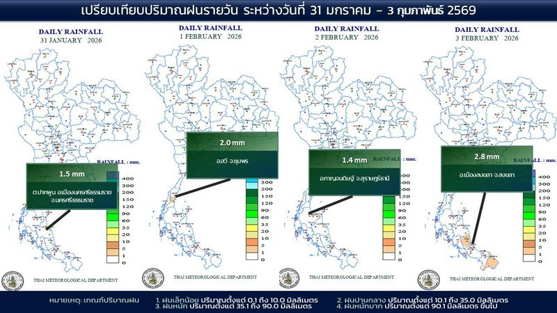 - 07:00 แผนที่เปรียบเทียบพื้นที่ที่มีปริมาณฝนสูงสุดในประเทศไทยรอบ 24 ชั่วโมงย้อนหลัง 4 วัน
