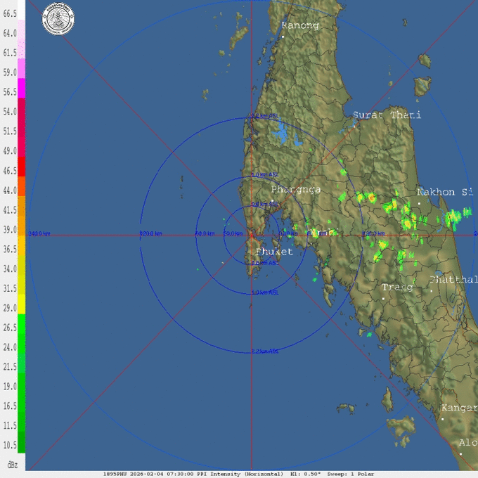 - 15:45 เรดาร์ตรวจอากาศ TMD แบบเคลื่อนไหวรัศมี 240 กม.ศูนย์กลางที่จังหวัดภูเก็ต แสดงกลุ่มฝนระหว่าง 1 ชั่วโมง 15 นาที ที่ผ่านมา