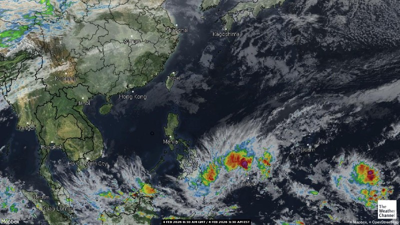 - 15:30 ภาพดาวเทียมย้อมสีจาก TWC แสดงกลุ่มฝนในเอเชียตะวันออกเฉียงใต้และโซนตะวันตกของมหาสมุทรแปซิฟิกเวลานี้