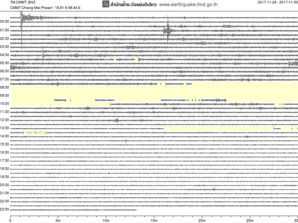 - กราฟแผ่นดินไหวจากสถานี เขื่อนสิริกิติ์ จ.อุตรดิตถ์ UTTA ของสำนักเฝ้าระวังฯ กรมอุตุฯ จากเวลา 07:00 เมื่อวานนี้ถึง 07:00 เช้านี้