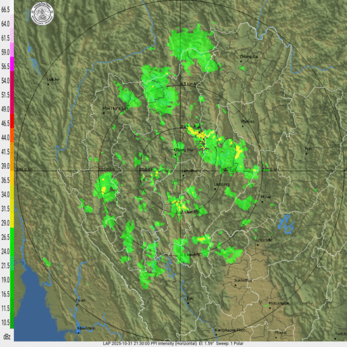 - 05:45 เรดาร์ฝน TMD ลำพูน (แบบเคลื่อนไหว) แสดงกลุ่มฝนที่ตกในภาคเหนือ ในช่วง 1 ชั่วโมง 15 นาที ที่ผ่านมา (เวลาในภาพเป็นเวลา UTC ต้องบวก 7 ชั่วโมงให้เป็นเวลาไทย)