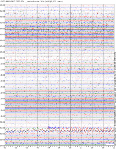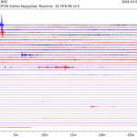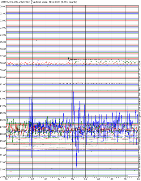 - 06:59 กราฟแผ่นดินไหวชนิดที่ใช้ดูเวลาเกิดเหตุเป็นหลัก แสดงภาพตามแนวตั้ง (BHZ) จากสถานีเครือข่าย IRIS สาขาเชียงใหม่ (CHTO) จาก 07:00 เช้าเมื่อวานนี้จนถึงเวลานี้ เส้นกราฟตามแนวนอนเส้นละ 10 นาที แยกสีเส้นกราฟเพื่อให้ดูได้ง่าย ช่องแบ่งตามแนวตั้งช่องละ 1 นาที