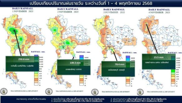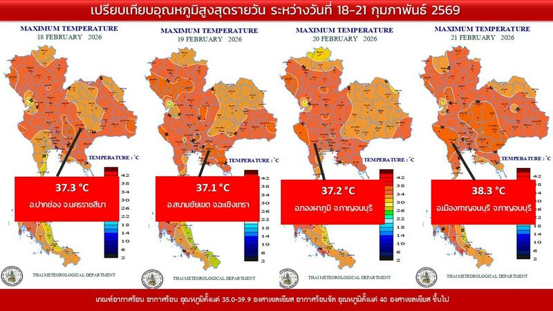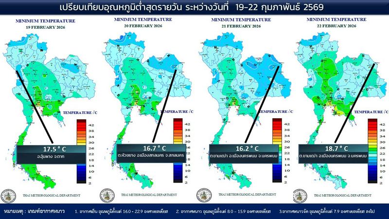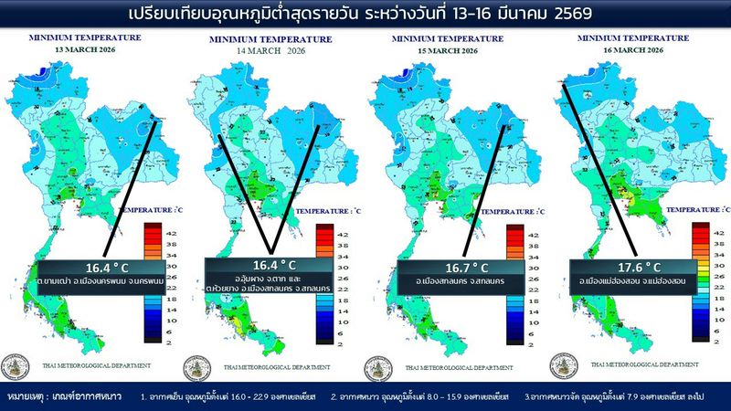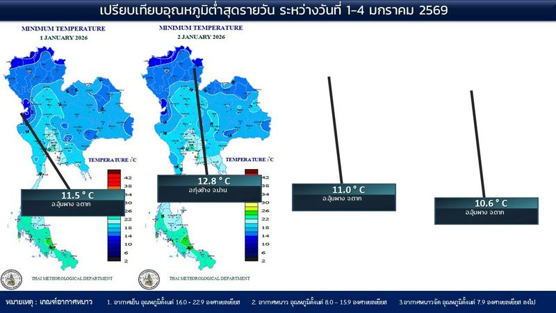 - 07:00 แผนที่เปรียบเทียบอุณหภูมิต่ำสุดในประเทศไทยรอบ 24 ชั่วโมงย้อนหลัง 4 วัน