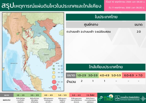 - 06:00 สรุปเหตุการณ์แผ่นดินไหวในประเทศไทยและเพื่อนบ้านตลอด 24 ชั่วโมงที่ผ่านมาที่ตรวจวัดได้โดยกรมอุตุฯ
