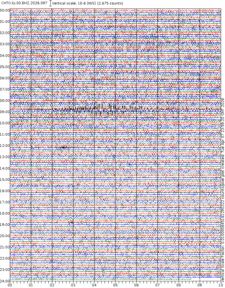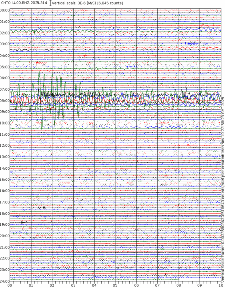 - 06:58 กราฟแผ่นดินไหวชนิดที่ใช้ดูเวลาเกิดเหตุเป็นหลัก แสดงภาพตามแนวตั้ง (BHZ) จากสถานีเครือข่าย IRIS สาขาเชียงใหม่ (CHTO) จาก 07:00 เช้าเมื่อวานนี้จนถึงเวลานี้ เส้นกราฟตามแนวนอนเส้นละ 10 นาที แยกสีเส้นกราฟเพื่อให้ดูได้ง่าย ช่องแบ่งตามแนวตั้งช่องละ 1 นาที