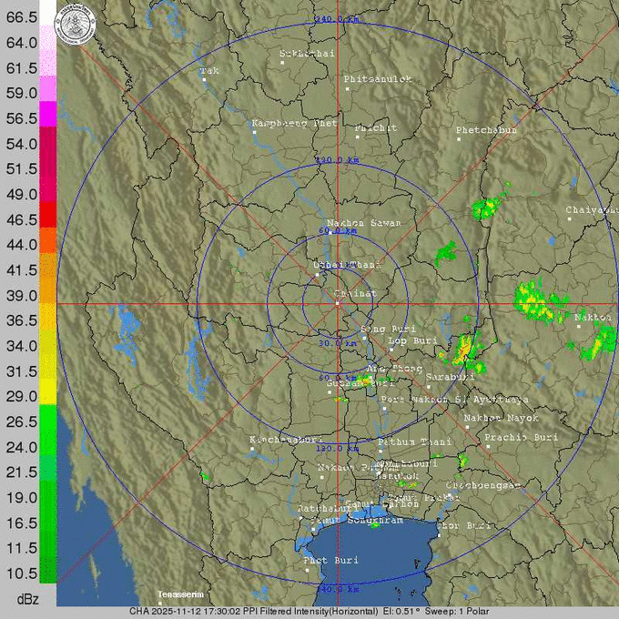 - 01:45 เรดาร์ฝน TMD ชัยนาท (แบบเคลื่อนไหว) แสดงกลุ่มฝนที่ตกในกลางช่วง 1 ชั่วโมง15 นาทีที่ผ่านมา (เวลาในภาพเป็นเวลา UTC ต้องบวก 7 ชั่วโมงให้เป็นเวลาไทย)
