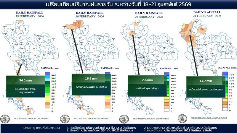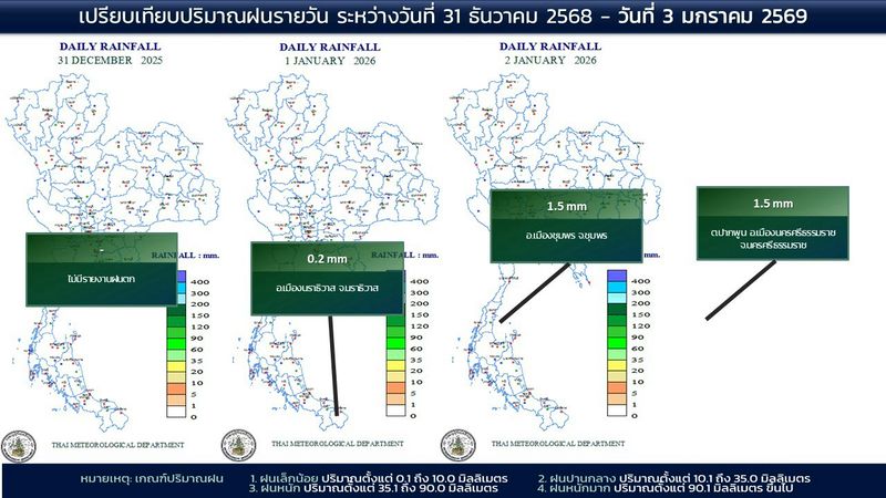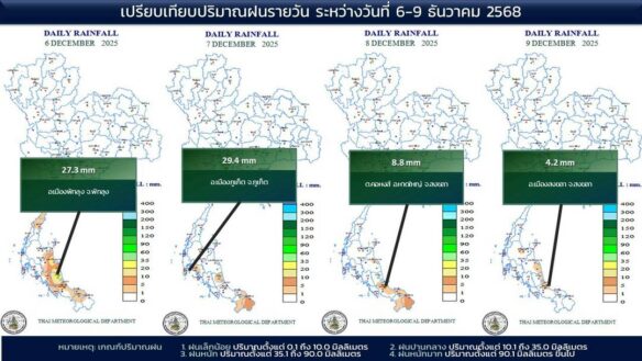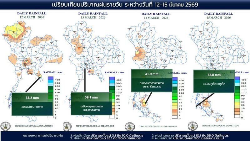 - 07:00 แผนที่เปรียบเทียบพื้นที่ที่มีปริมาณฝนสูงสุดในประเทศไทยรอบ 24 ชั่วโมงย้อนหลัง 4 วัน