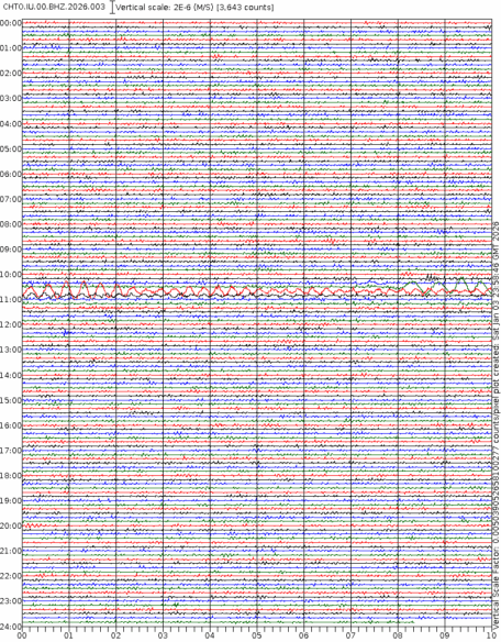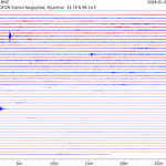- 06:45 กราฟแผ่นดินไหว ช่วง 24 ชั่วโมงที่ผ่านมา บันทึกจากสถานีกรุงเนปิดอว์ ประเทศพม่า (กราฟนี้เน้นใช้ประโยชน์เรื่องของเวลาที่เกิดแผ่นดินไหว โดยแยกสีเป็นแดงน้ำเงินสีละครึ่งชั่วโมงเพื่อให้ดูง่าย ส่วนเรื่องขนาดแผ่นดินไหว กราฟนี้ไม่อาจใช้ระบุตัวเลขที่ชัดเจน)