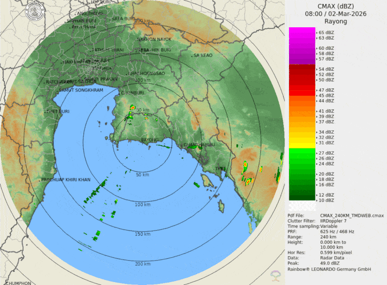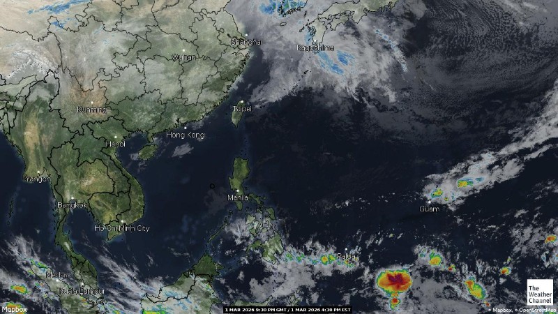 - 04:30 ภาพดาวเทียมย้อมสีจาก TWC แสดงกลุ่มฝนในเอเชียตะวันออกเฉียงใต้และโซนตะวันตกของมหาสมุทรแปซิฟิกเวลานี้