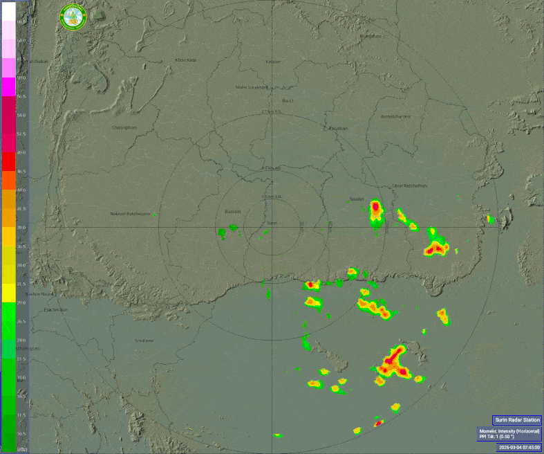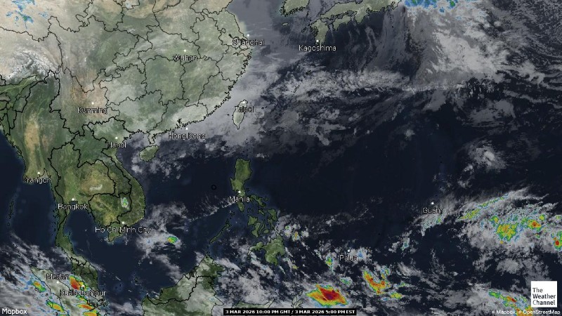 - 05:00 ภาพดาวเทียมย้อมสีจาก TWC แสดงกลุ่มฝนในเอเชียตะวันออกเฉียงใต้และโซนตะวันตกของมหาสมุทรแปซิฟิกเวลานี้
