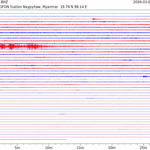 - 05:42 กราฟแผ่นดินไหว ช่วง 24 ชั่วโมงที่ผ่านมา บันทึกจากสถานีกรุงเนปิดอว์ ประเทศพม่า (กราฟนี้เน้นใช้ประโยชน์เรื่องของเวลาที่เกิดแผ่นดินไหว โดยแยกสีเป็นแดงน้ำเงินสีละครึ่งชั่วโมงเพื่อให้ดูง่าย ส่วนเรื่องขนาดแผ่นดินไหว กราฟนี้ไม่อาจใช้ระบุตัวเลขที่ชัดเจน)
