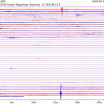- 10:07 กราฟแผ่นดินไหว ช่วง 24 ชั่วโมงที่ผ่านมา บันทึกจากสถานีกรุงเนปิดอว์ ประเทศพม่า (กราฟนี้เน้นใช้ประโยชน์เรื่องของเวลาที่เกิดแผ่นดินไหว โดยแยกสีเป็นแดงน้ำเงินสีละครึ่งชั่วโมงเพื่อให้ดูง่าย ส่วนเรื่องขนาดแผ่นดินไหว กราฟนี้ไม่อาจใช้ระบุตัวเลขที่ชัดเจน)