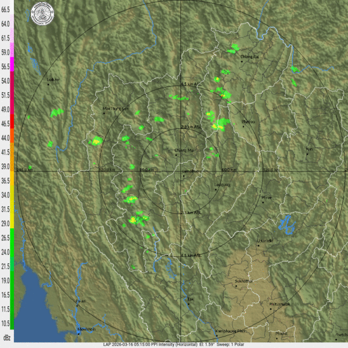 - 13:30 เรดาร์ตรวจอากาศ TMD แบบเคลื่อนไหว รัศมี 240 กม. ศูนย์กลางที่ จ.ลำพูนแสดงกลุ่มฝนตลอด 1 ชั่วโมง 15 นาที ที่ผ่านมา