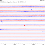 - 06:42 กราฟแผ่นดินไหว ช่วง 24 ชั่วโมงที่ผ่านมา บันทึกจากสถานีกรุงเนปิดอว์ ประเทศพม่า (กราฟนี้เน้นใช้ประโยชน์เรื่องของเวลาที่เกิดแผ่นดินไหว โดยแยกสีเป็นแดงน้ำเงินสีละครึ่งชั่วโมงเพื่อให้ดูง่าย ส่วนเรื่องขนาดแผ่นดินไหว กราฟนี้ไม่อาจใช้ระบุตัวเลขที่ชัดเจน)