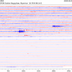 - 07:53 กราฟแผ่นดินไหว ช่วง 24 ชั่วโมงที่ผ่านมา บันทึกจากสถานีกรุงเนปิดอว์ ประเทศพม่า (กราฟนี้เน้นใช้ประโยชน์เรื่องของเวลาที่เกิดแผ่นดินไหว โดยแยกสีเป็นแดงน้ำเงินสีละครึ่งชั่วโมงเพื่อให้ดูง่าย ส่วนเรื่องขนาดแผ่นดินไหว กราฟนี้ไม่อาจใช้ระบุตัวเลขที่ชัดเจน)
