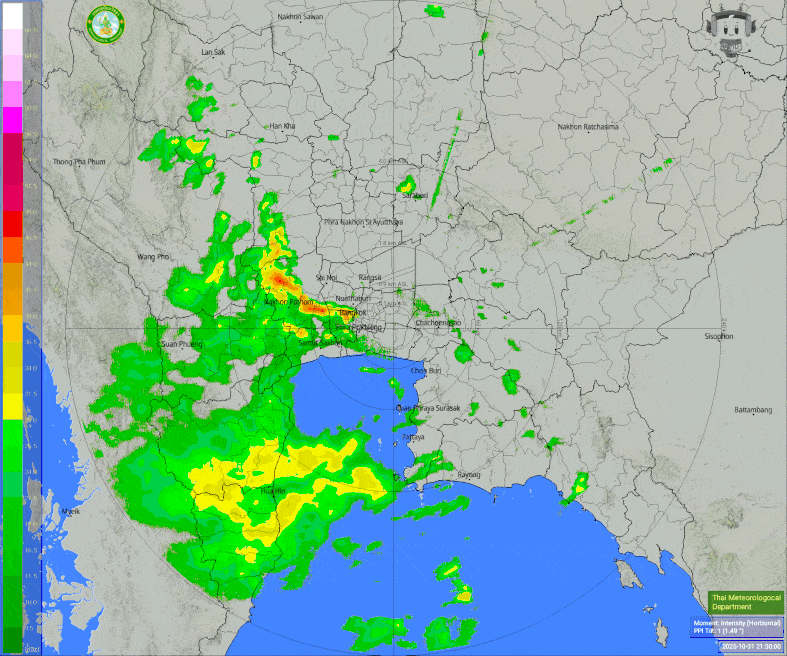 - 00:05 เรดาร์ตรวจฝนจากสำนักการระบายน้ำ กทม ที่หนองแขม (แบบเคลื่อนไหว) แสดงกลุ่มฝนที่ตกในกรุงเทพฯและปริมณฑลรวมทั้งบางจังหวัดในภาคกลางตอนล่างและภาคตะวันออกตลอด 55 นาทีที่ผ่านมา