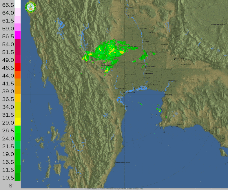 - 22:45 เรดาร์ตรวจอากาศ TMD แบบเคลื่อนไหว รัศมี 240 กม. ศูนย์กลางที่ สมุทรสงคราม แสดงกลุ่มฝนตลอด 1 ชั่วโมง 15 นาที ที่ผ่านมา