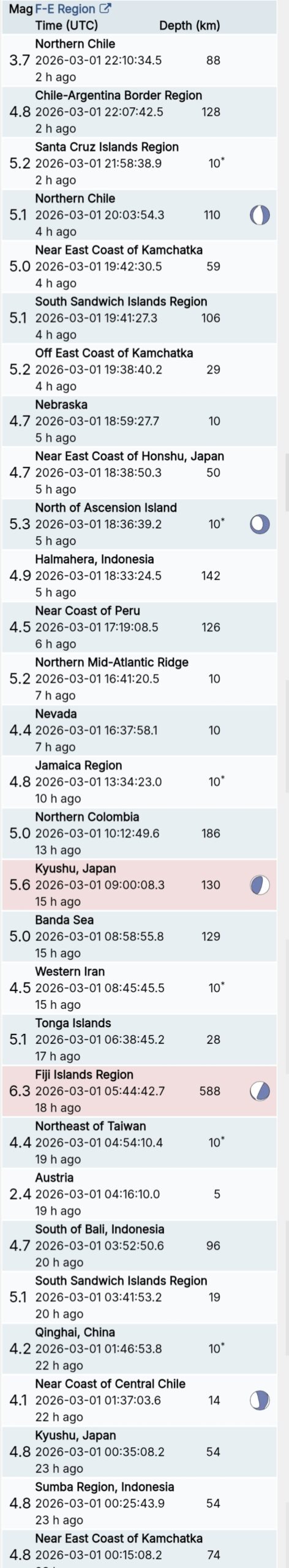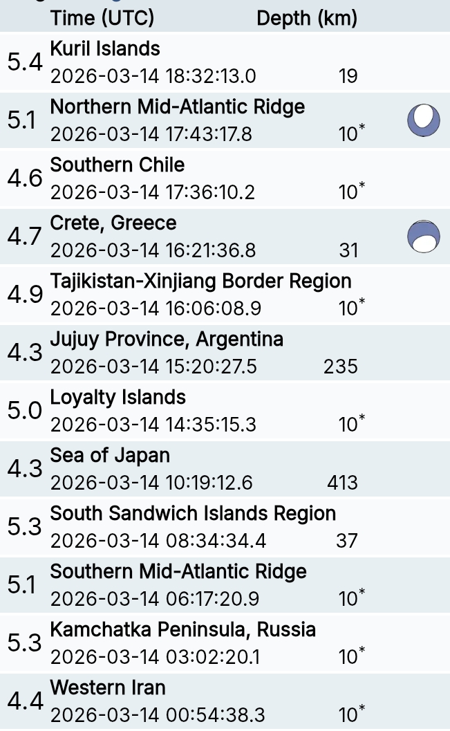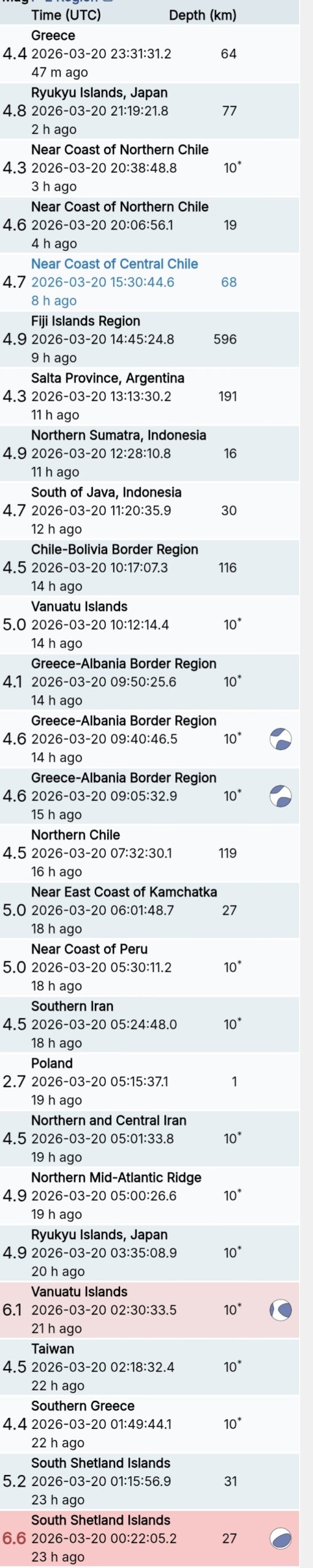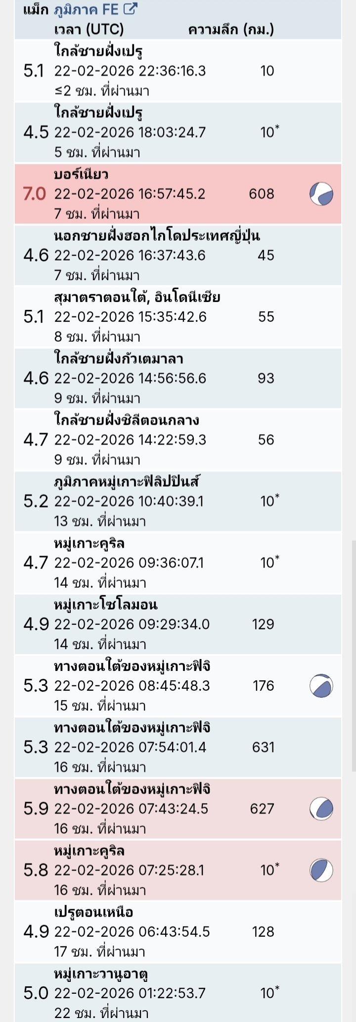 สรุปรายการแผ่นดินไหวและอาฟเตอร์ช็อกทั่วโลกจาก Geofon เยอรมนี ช่วง 07:00 เมื่อวานนี้ ถึง 07:00 เช้าวันนี้ (เวลาในตารางเป็น UTC ต้องบวก 7 ชั่วโมงให้เป็นเวลาไทย)