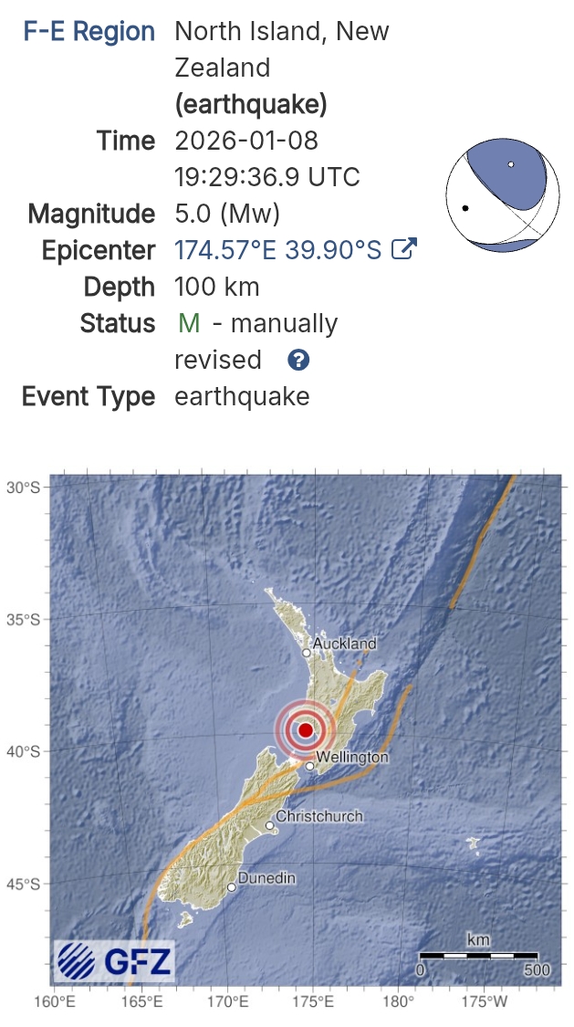 - 02:29 แผ่นดินไหวขนาด 5.0 (Mw) ลึก 100 กม.พิกัด 174.57°E 39.90°S เกาะเหนือ นิวซีแลนด์