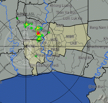 - 08:05 เรดาร์ตรวจฝนจากสำนักการระบายน้ำ กทม ที่หนองแขม (แบบเคลื่อนไหว) แสดงกลุ่มฝนที่ตกในกรุงเทพฯและปริมณฑลรวมทั้งบางจังหวัดในภาคกลางตอนล่างและภาคตะวันออกตลอด 55 นาทีที่ผ่านมา