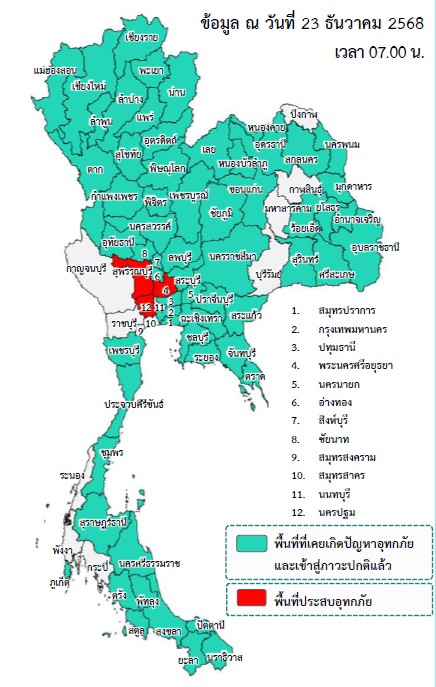 - 07:00 แผนที่แสดงจังหวัดที่ยังคงมีปัญหาอุทกภัยอยู่ในเวลานี้ (สีแดง) และที่เข้าสู่สภาวะปกติแล้ว (สีเขียว)