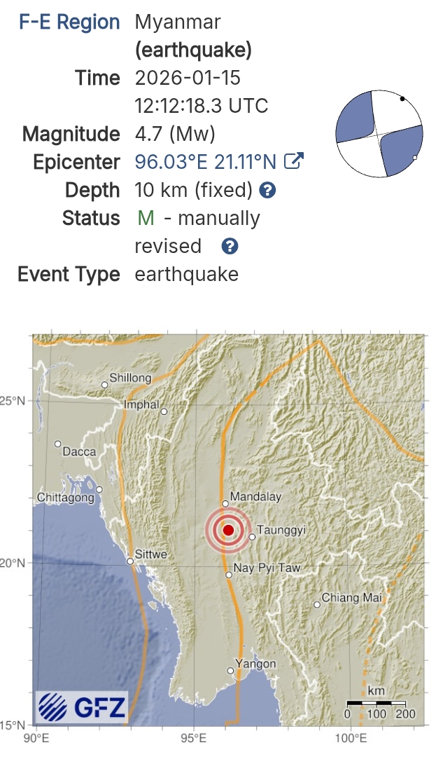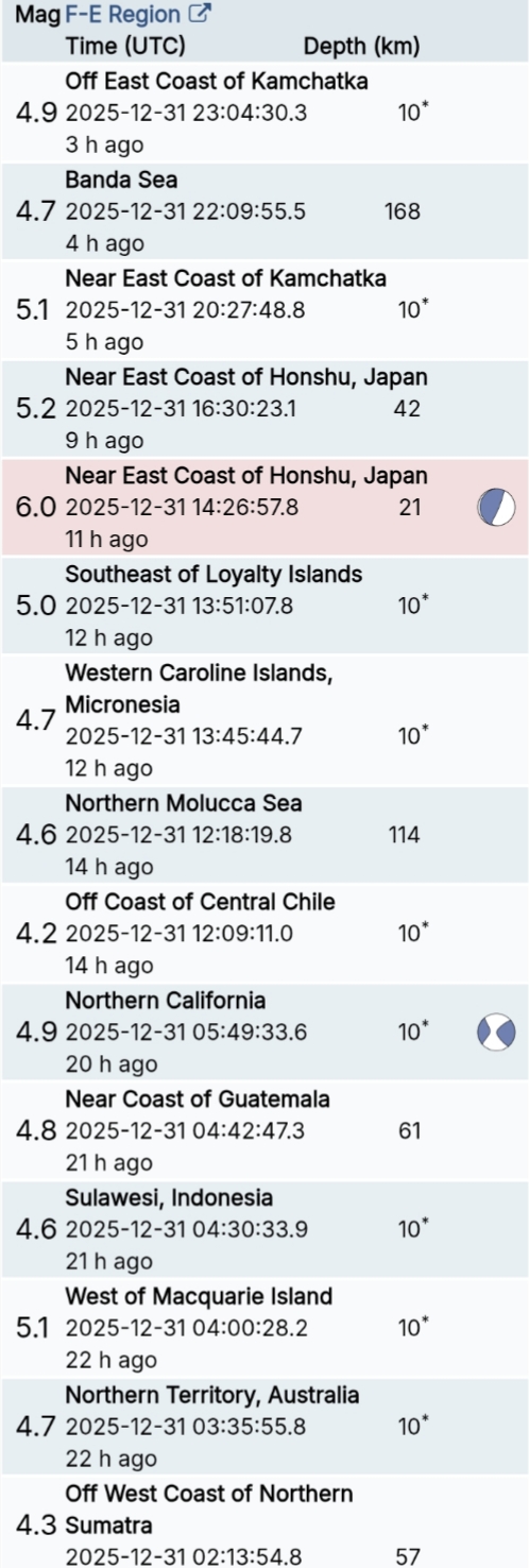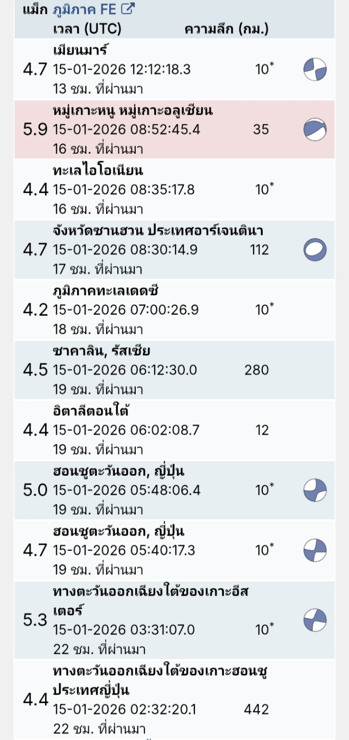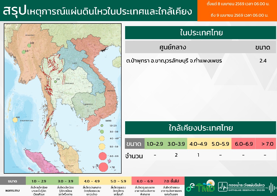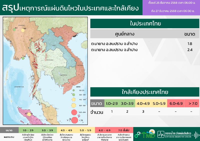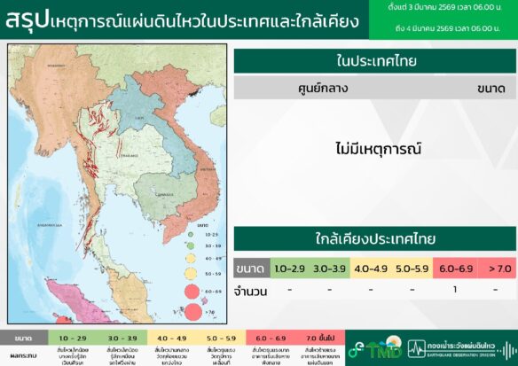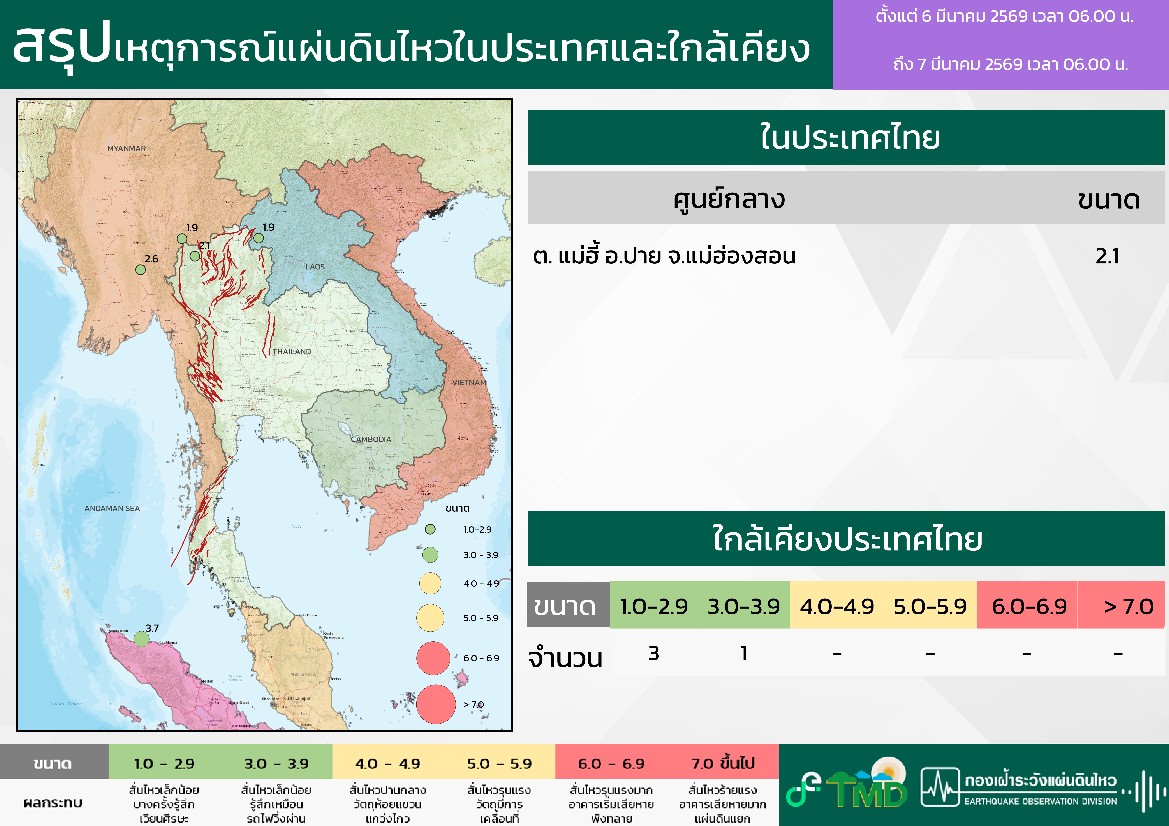 - 06:00 สรุปเหตุการณ์แผ่นดินไหวในประเทศไทยและเพื่อนบ้านตลอด 24 ชั่วโมงที่ผ่านมาที่ตรวจวัดได้โดยกรมอุตุฯ