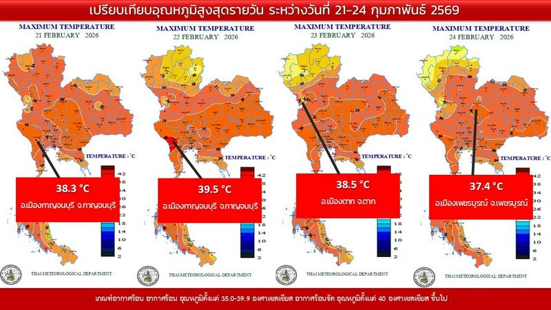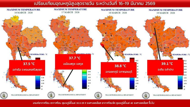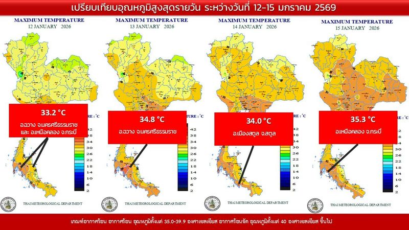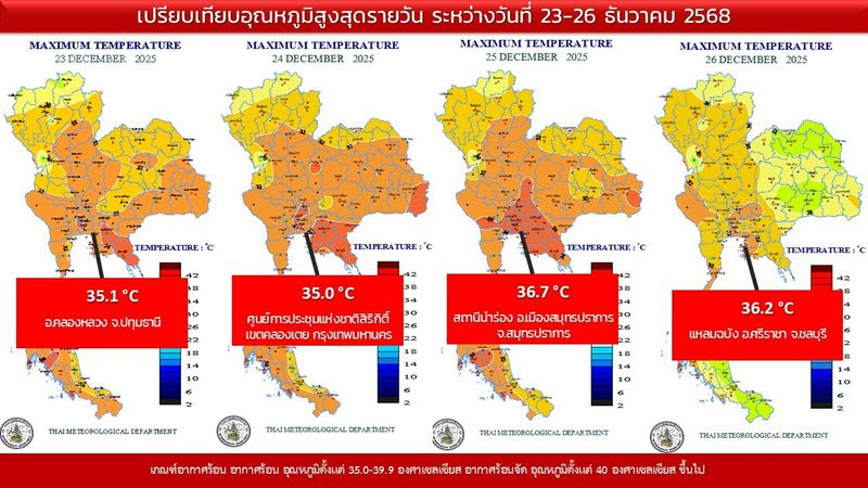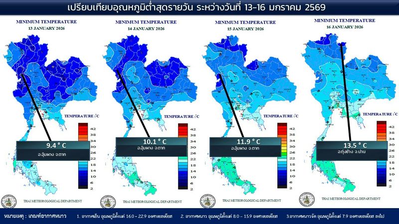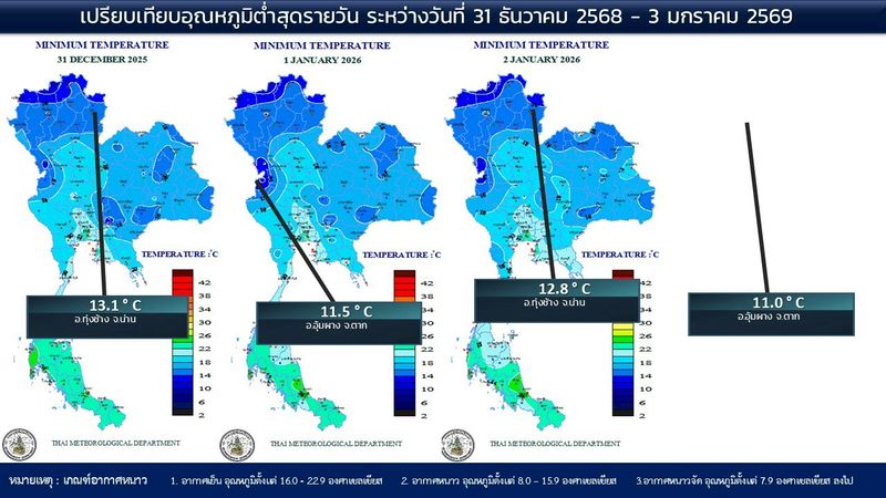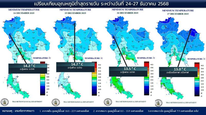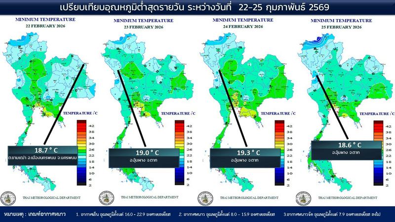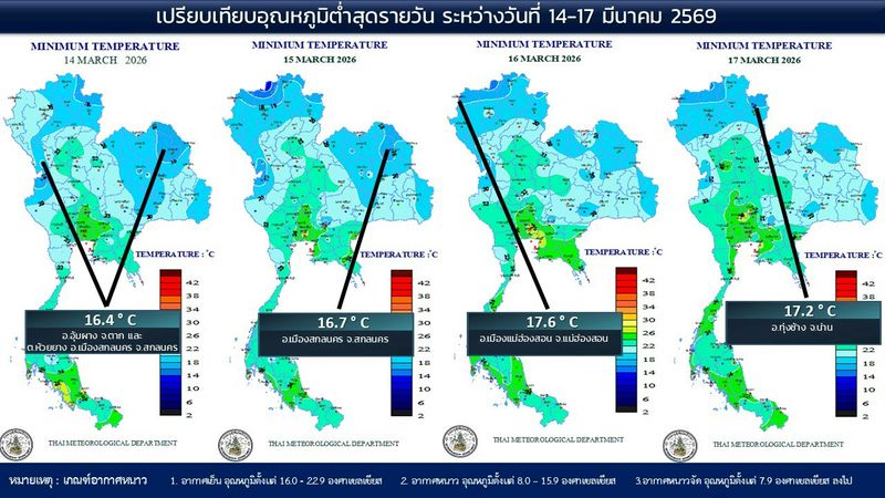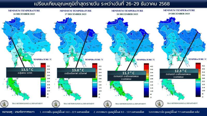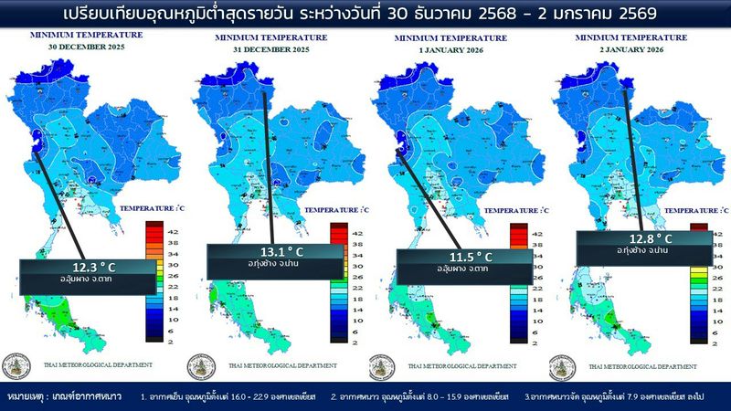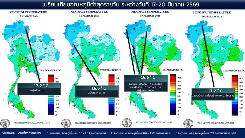 - 07:00 แผนที่เปรียบเทียบอุณหภูมิต่ำสุดในประเทศไทยรอบ 24 ชั่วโมงย้อนหลัง 4 วัน